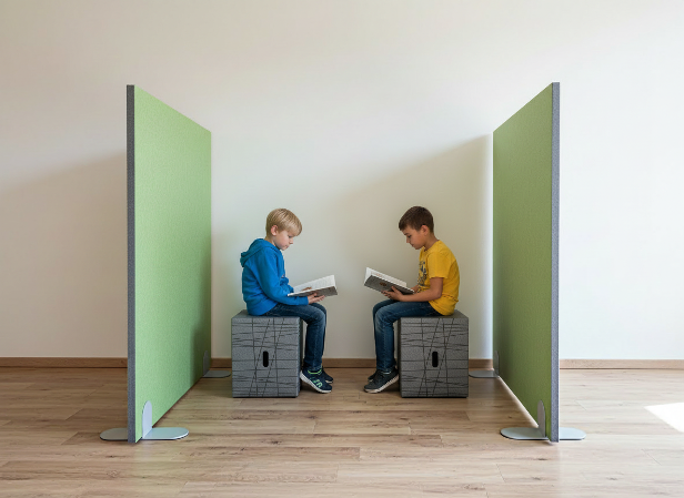 Kombinierbar mit unseren Absorber-Stellwänden PET G25 als flexibler Rückzugsort. Ideal auch für Lernflure, Klassenzimmer, Mensa.